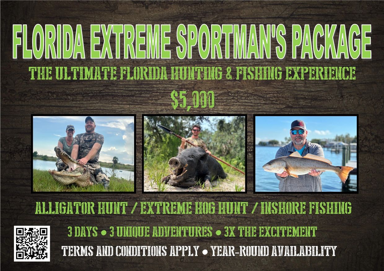 Are you ready to take your next Florida hunting and fishing adventure to the next level? Look no further than Bienvenue Outdoors and our FLORIDA EXTREME SPORTSMAN'S PACKAGE. We have taken the best that Florida has to offer and bundled them up for you in one exciting package. You get one (1) Alligator Hunt, for an alligator between 8' and 9' 10", plus one (1) Trophy Wild Boar Hunt, and to top it all off a 3/4 day inshore fishing trip for some of Florida's most popular game fish including Snook, Redfish, Spotted Sea Trout and more. So what are you waiting for? Contact Bienvenue Outdoors today and book the ultimate Florida hunting and fishing experience today!